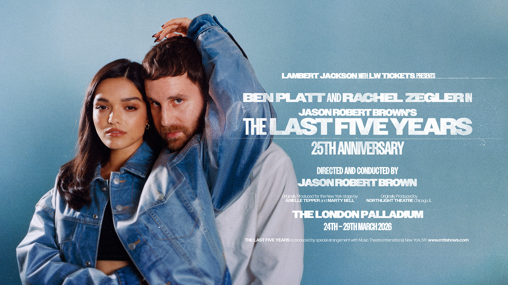 Tony, Grammy and Emmy Award winner Ben Platt (Dear Evan Hansen, Pitch Perfect, Parade) and Golden Globe winner Rachel Zegler (Evita, The Hunger Games, Snow White), two of the most dynamic and celebrated performers of their generation, star together in a very special new concert staging of Jason Robert Brown’s The Last Five Years playing from Tuesday 24 to Sunday 29 March.